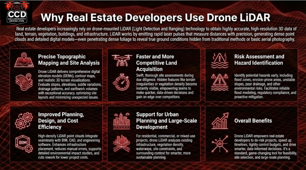 Real estate developers are increasingly using drone-mounted LiDAR (Light Detection and Ranging) to capture highly accurate, high-resolution 3D data of land, terrain, vegetation, buildings, and infrastructure.